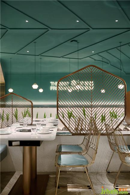 天花上是翻涌的海浪和無限放大的椰樹葉子脈絡(luò),營造出在深海里吃椰子雞的新奇氛圍。金屬材質(zhì)的應(yīng)用讓餐廳的輕奢、高級感呼之欲出。