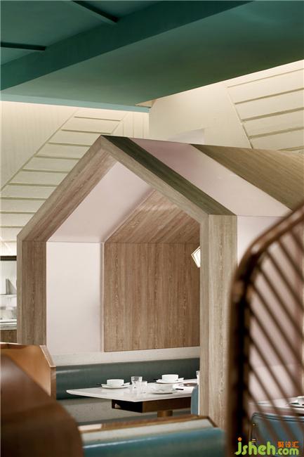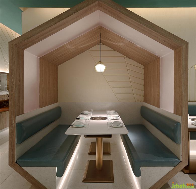 走在水墨石上,有一種沙灘漫步的感覺,這是金沙色水磨石的功勞。除了蔚藍的天花,深海和淺海還呼應(yīng)著餐廳里深藍和淺藍色的桌椅。餐廳設(shè)計