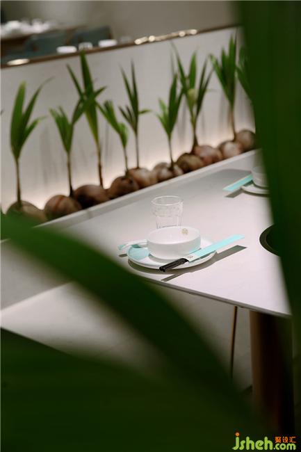 而墻上放大的椰樹葉子則寓意食材的“綠色、健康、自然”,這和椰客Slogan追求的“不接受有水分的人生”配合默契。