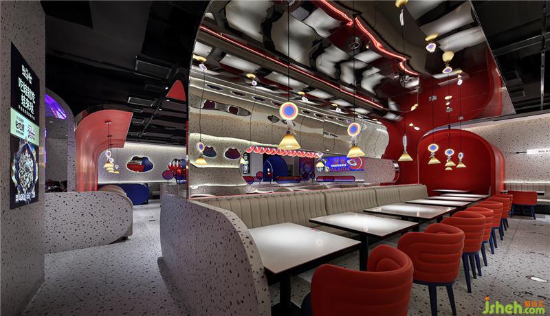 特別鮮明的鏡面反射區(qū)隔,分割不同的情緒空間,鏡面反射出迷幻色彩。一個(gè)烏托邦式的餐飲空間呼之欲出。
