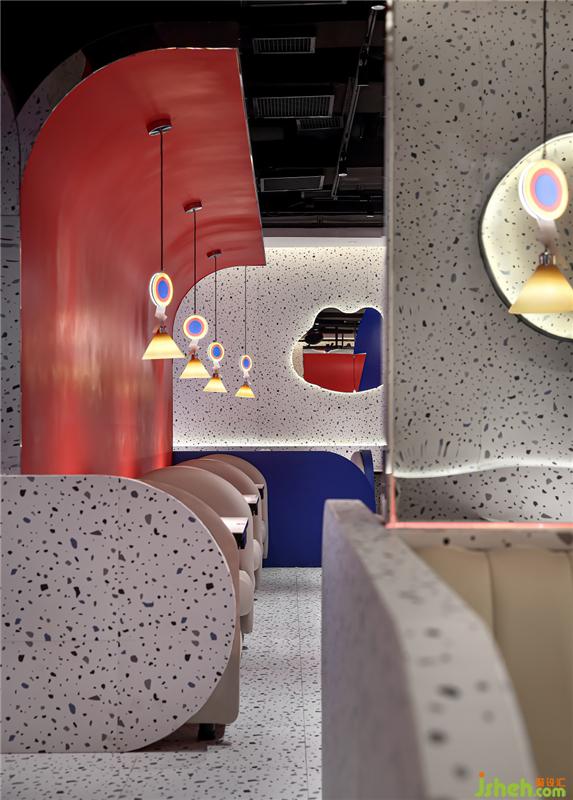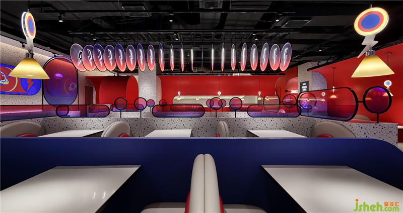 本案餐廳設(shè)計(jì),品牌和空間相輔相成,高度統(tǒng)一。元素應(yīng)用上,為突出使品牌的獨(dú)特性,設(shè)計(jì)師將蛙來噠的logo解構(gòu),使蛙成為空間的主要輪廓,以空間呼應(yīng)時(shí)間,用色彩營(yíng)造情緒。