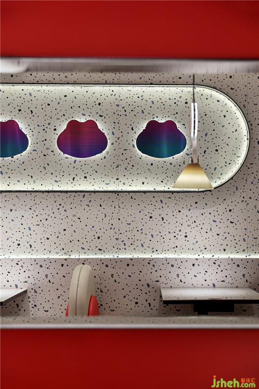 水磨石的質(zhì)感,皮革的溫潤(rùn),鏡面鋼板的倒影,漸變玻璃的迷幻效果,一起精妙配合,營(yíng)造出繁雜中有簡(jiǎn)單、簡(jiǎn)單中見細(xì)節(jié)、情感張揚(yáng)又內(nèi)斂細(xì)膩的的蛙來噠餐廳。