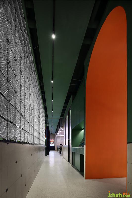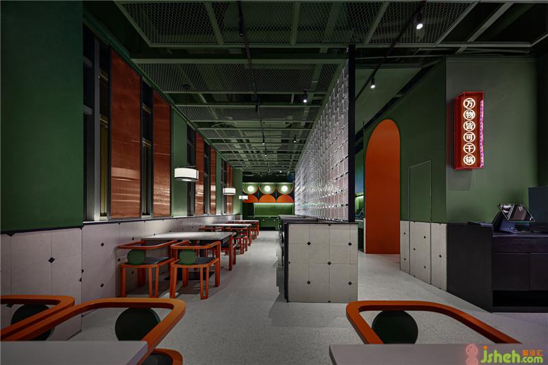 改造之前的集裝箱位置比較矮小,設(shè)計(jì)改用水紋不銹鋼來(lái)漫反射,從視覺(jué)上著手,拉伸空間,消減壓抑感。藤椒綠墻上“小火人”活潑好逗,不僅強(qiáng)化著炭舍的品牌特色(十六中醬料秘制· 歡辣過(guò)癮 · 因歡辣而歡聚),也調(diào)劑著顧客們的情緒,讓用餐氛圍變得輕松愉悅。