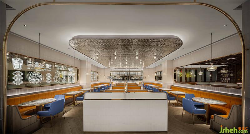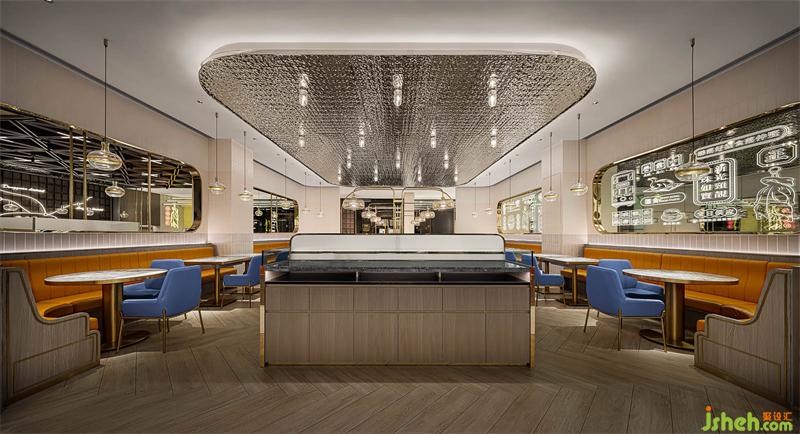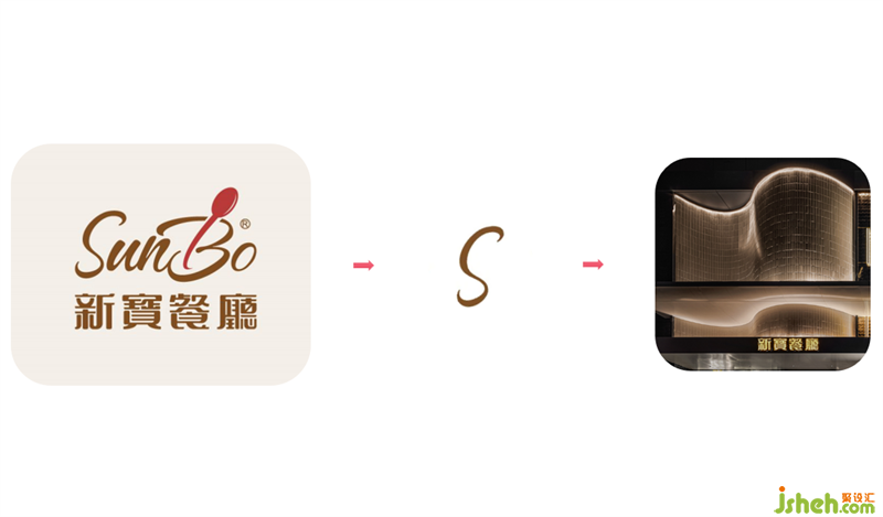 本案港式餐廳設(shè)計從新寶餐廳的logo提取元素,以弧形、圓角、矩形的轉(zhuǎn)化應(yīng)用,構(gòu)筑沉浸式的現(xiàn)代港意空間。門頭立體化“S”弧造型有裝置意味,霸道式吸睛,不給人思索余地,卻高度聚焦品牌元素,表現(xiàn)視覺力量。水紋不銹鋼更是形變的弧形之濫觴,在規(guī)則和靈動之間的自由跳躍,躍動的弧形和硬挺矩形碰撞,方中有弧,弧里有方,張弛有度。