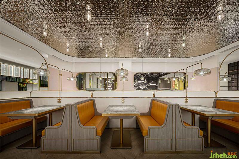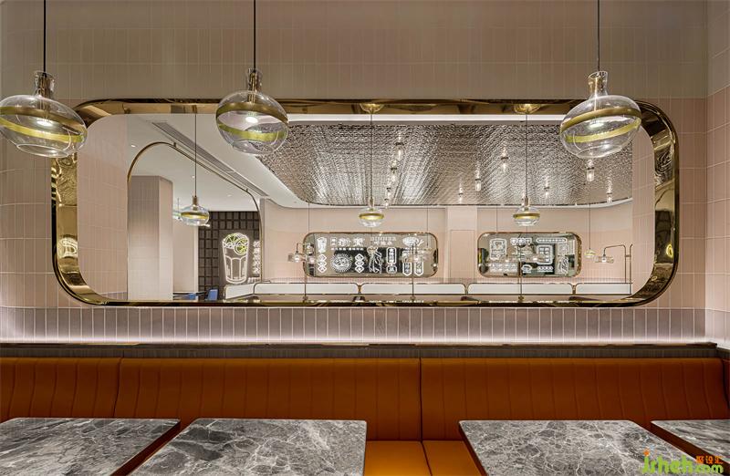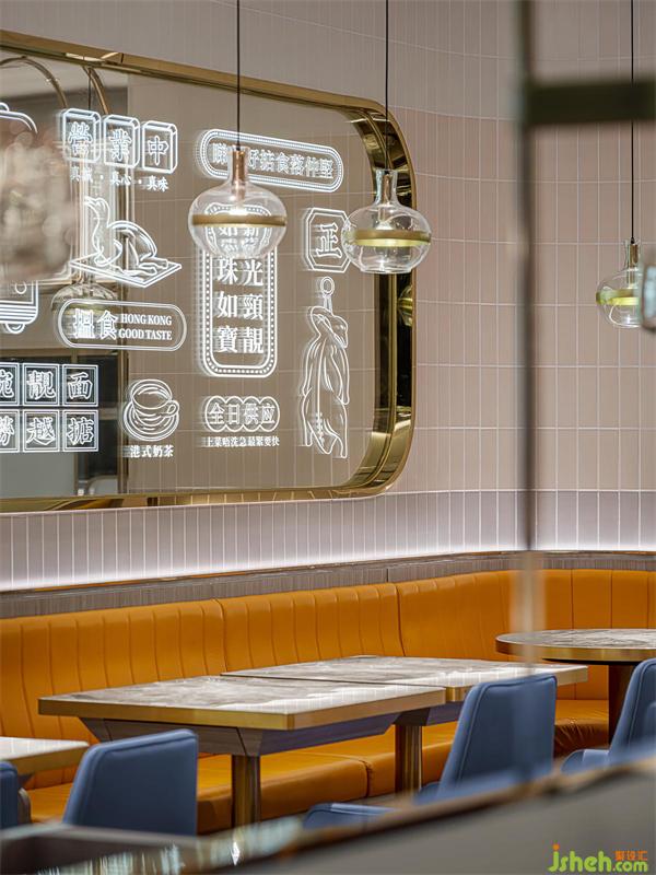 港式餐廳設(shè)計室內(nèi)空間上下呼應(yīng),左右聯(lián)動,左邊天花上水紋不銹鋼暗藏?zé)艄?,精致感瞬間提升了幾個度。鏡面上,香港特色的招幌辨識度十足,霓虹發(fā)光字悄無聲息地拆解香港文化。三種顏色地瓷片變化,讓視覺感觸連線著味蕾享受,并一次次環(huán)繞升華。