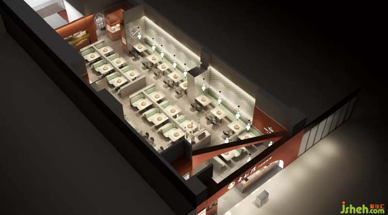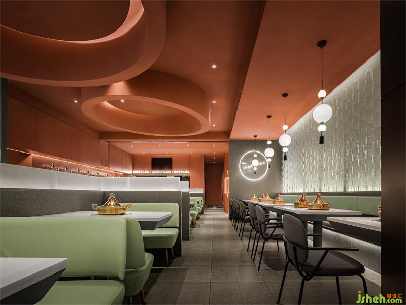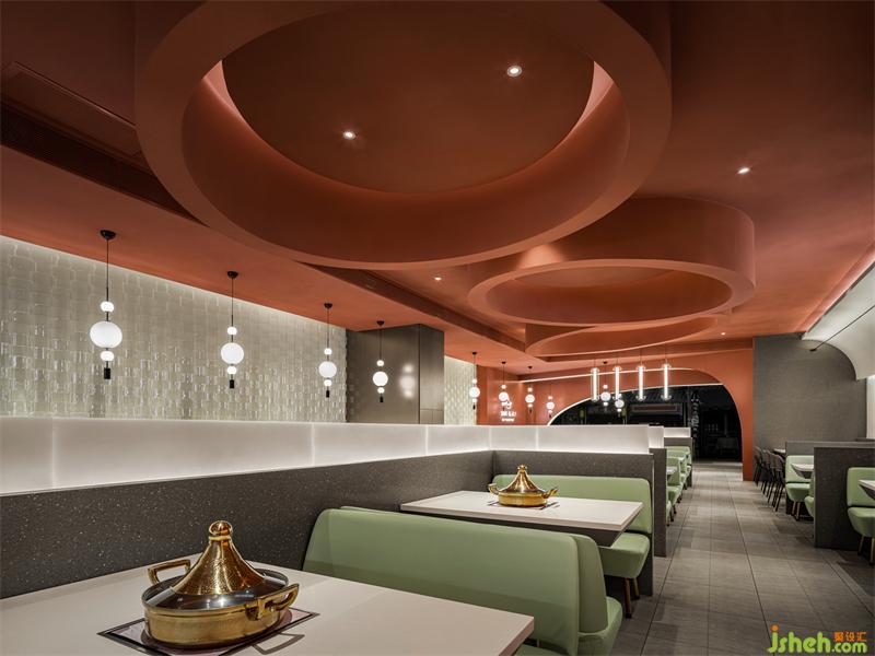 茶色天井營造出宮殿用餐氛圍,墻面造型是傳統(tǒng)屋檐的抽象賦形,呼應(yīng)著門頭的拱弧元素空間主色取自中國古建筑。大面積的茶色搭配練色,餐廳設(shè)計以銅綠為點綴,視覺上十分簡約。