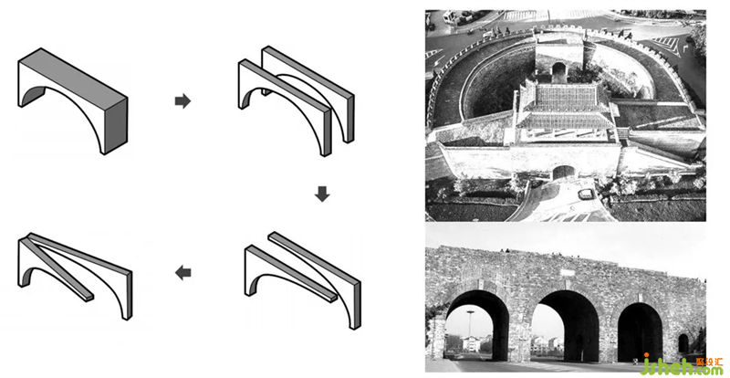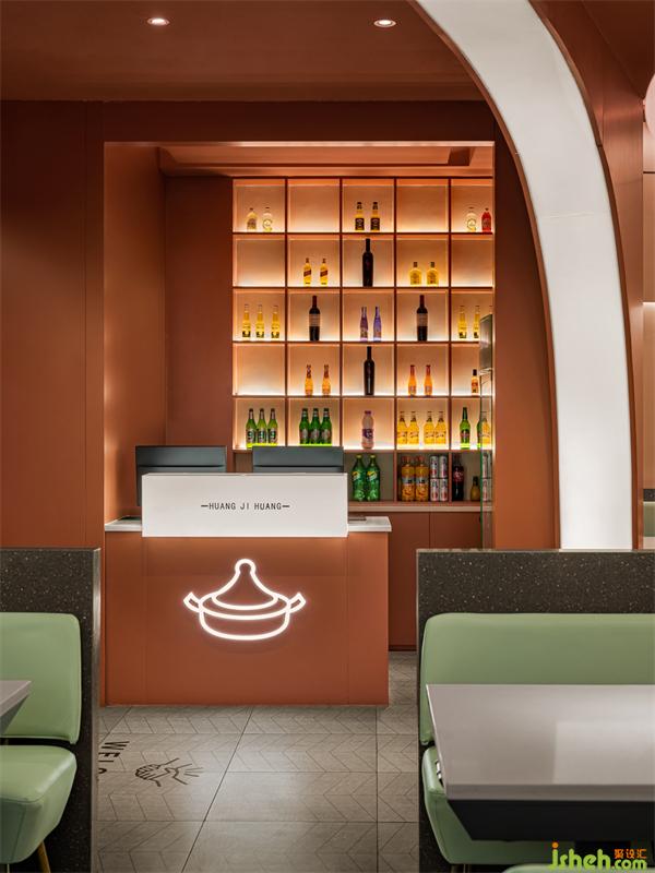 承接歷史的腳步,來到西安古城,瞭望城墻下,拱形門洞里,形形色色的人留往來穿梭,遠處晚霞散落,夜幕拉下,城門開啟,就是品嘗燜鍋的時刻。本案黃記煌升級設(shè)計,設(shè)計師將古城的布局整理演化,結(jié)合城墻的拱形元素,在入口打造一處“城門”打卡造型,兩道拱門交錯疊加,彼此呼應(yīng)。顧客走過2道拱門,才到城內(nèi),正式進入黃記煌這味蕾之城。