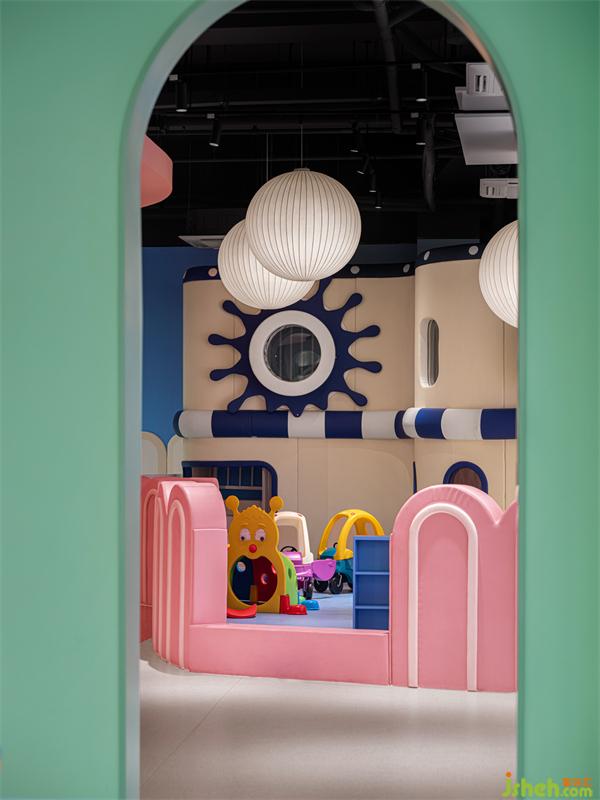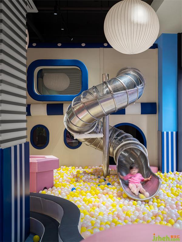 首先映入眼簾的是入口的藍(lán)色“認(rèn)知區(qū)”,歡聲笑語(yǔ)最多的地方。藍(lán)墻、紅籬、白燈,配合軟萌可愛的滑梯、泡泡池、艦艇,搭建兒童嬉戲玩樂的一隅天堂。