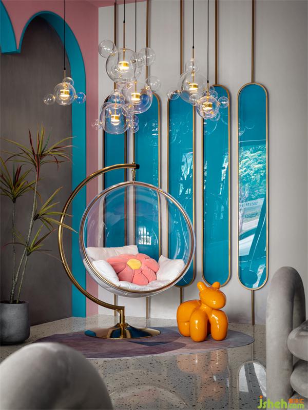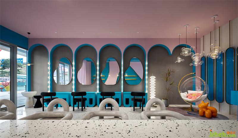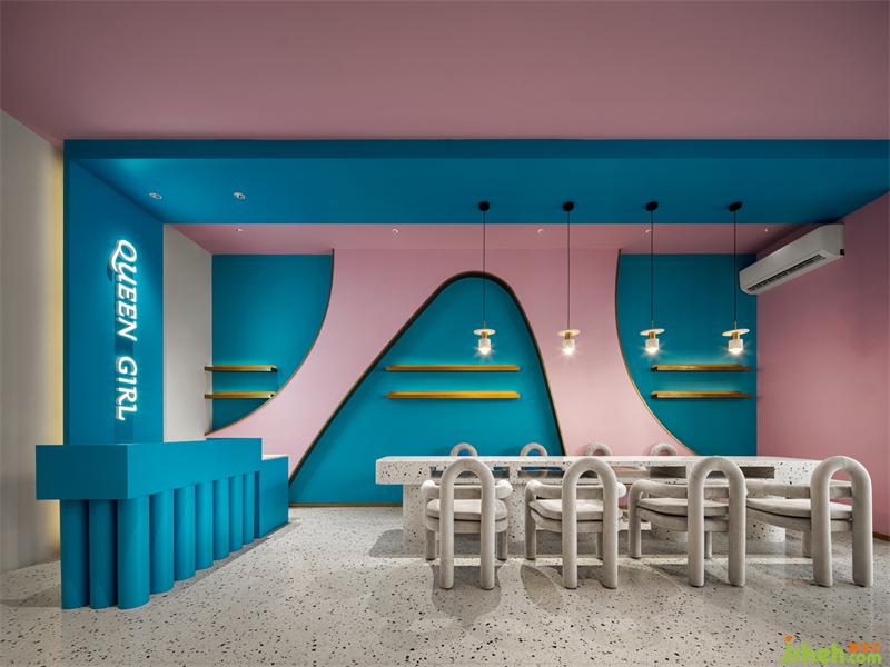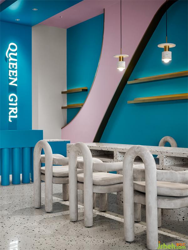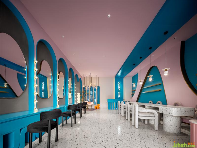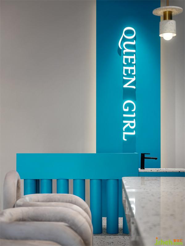 QUEEN GIRL與Flower June只一室之隔。QUEEN GIRL美甲區(qū)刪繁就簡,藍色和粉色以大面積體塊,碰撞出領(lǐng)異標新的火花。