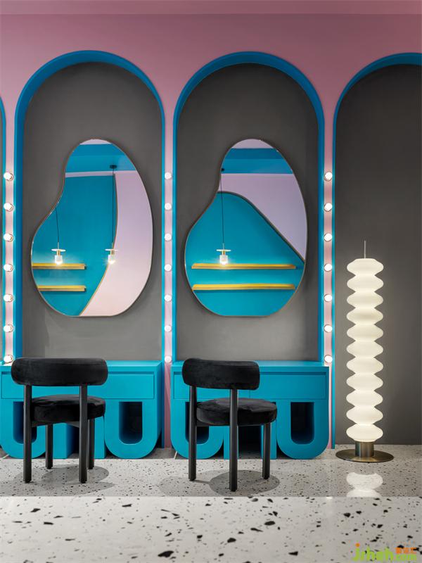 門頭logo周圍漫反射光影,自在而寫意;美甲室內(nèi)部拱形化妝臺排列有序,一個拱配一個米粒造型的鏡子,趣味的互動悄然開啟;