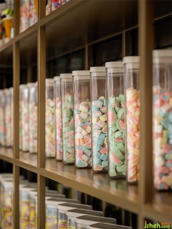 受冰淇淋視覺錘的吸引,來到甜甜的室內(nèi)空間。可見柜子里陳列糖果罐,墻壁上是巧克力網(wǎng)格,酥香流油的吧臺(tái),連燈籠也捎帶甜柔氣息,像是走進(jìn)了迪士尼童話電影《無敵破壞王》拉爾夫的糖果世界!