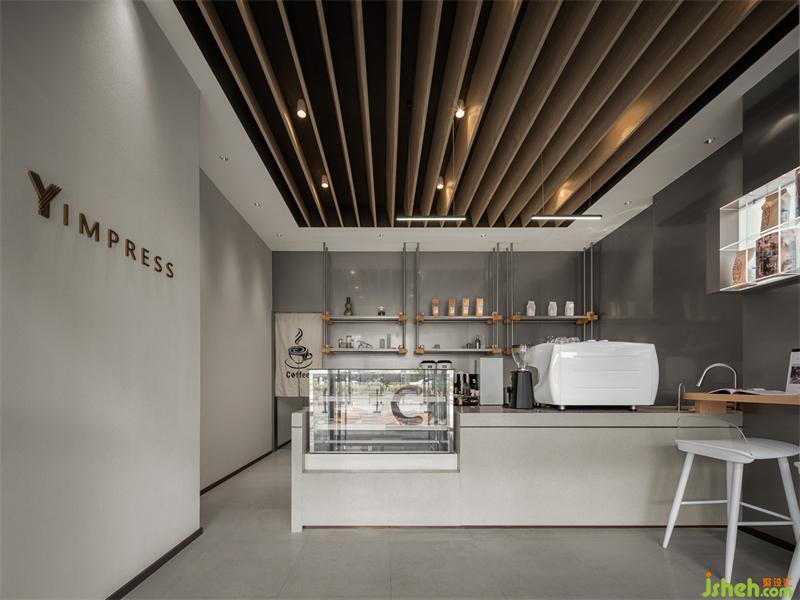 YIMPRESS咖啡店同樣給人深刻印象,內(nèi)斂沉著的灰藍(lán)色呈現(xiàn)極致干凈的氣質(zhì),就像咖啡品質(zhì)令人放心;還有柵板天花,吸音的同時(shí),豐富著空間的造型