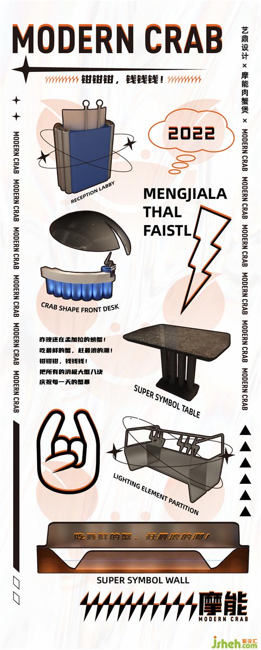 餐飲和設(shè)計不乏相似之處,設(shè)計師受到摩能美食理念啟發(fā),餐廳全案設(shè)計汲取摩能肉蟹煲主打食材“孟加拉蟹”為靈感來源,將孟加拉蟹的造型拆分解構(gòu)為不同幾何形態(tài),通過自由構(gòu)造的手法化為空間語言,穿透,而又沖破,再糅合,凸現(xiàn)品牌形象在“符號化”構(gòu)造中塑形。