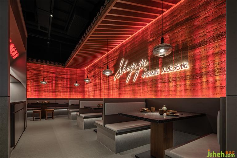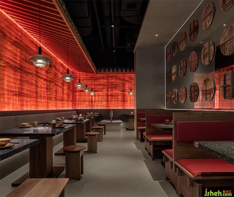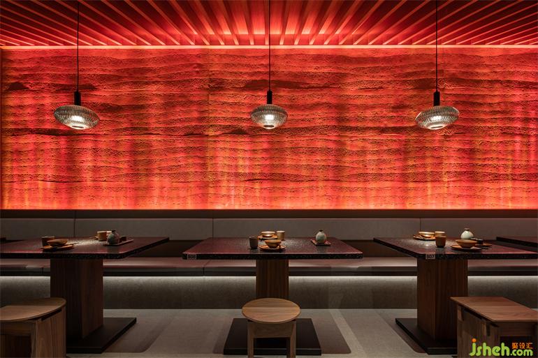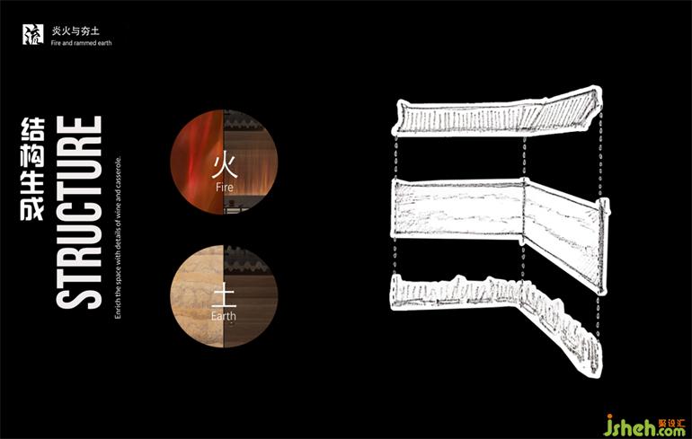 火生土,火與夯土也從火爐而來,暗涌之火,熱烈而激情,升騰于夯土之上,小酒館設計由動態(tài)火紋燈模擬,豐富表現(xiàn)形式的同時詮釋出動靜結合、自成一體的空間印記。