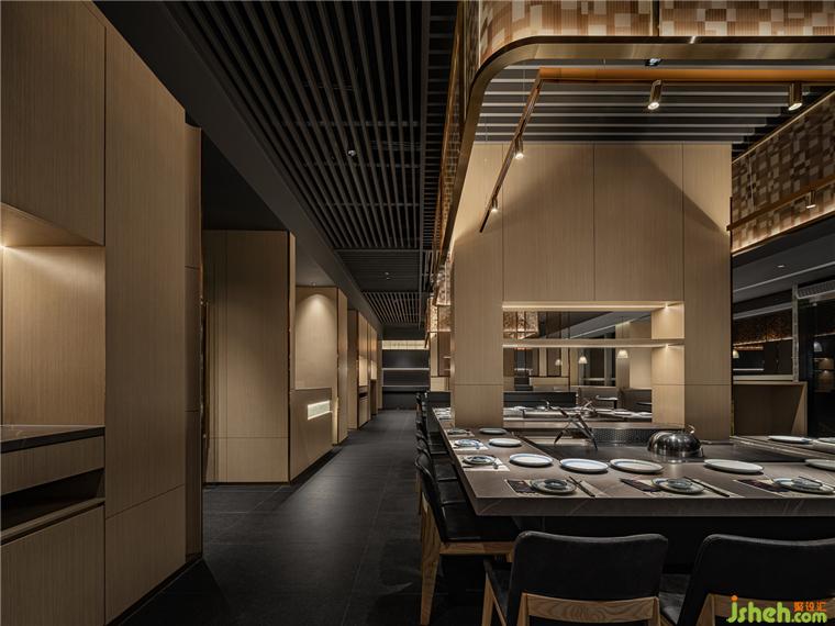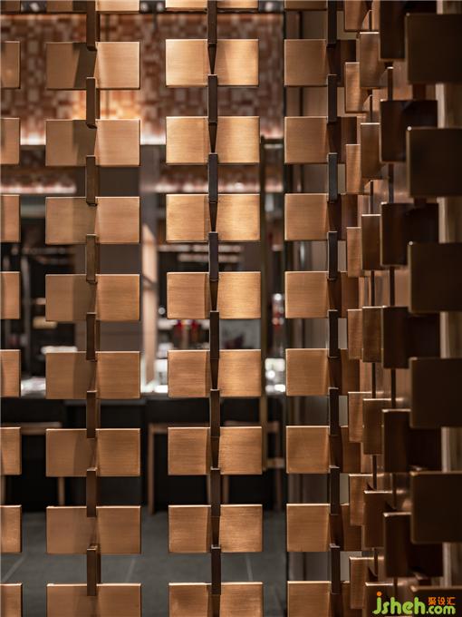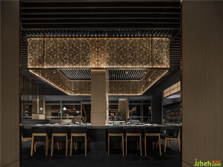主鐵板操作臺,作為空間視覺核心,由淺木色做底,淺灰、深灰外立面上下聚合,搭配暖調燈光組成,完成了核心色彩與內容填充。古銅金元素的介入將空間的色調與材質稍稍“破局”,也與大漁的風格調性遙相呼應。