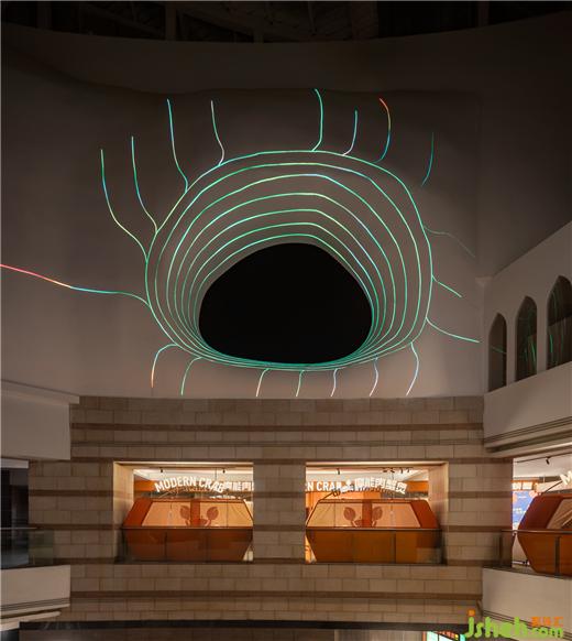 在崇尚“體驗(yàn)至上”的Z世代消費(fèi)主義大潮中,藝鼎深諳商業(yè)空間設(shè)計(jì)之道,餐廳設(shè)計(jì)以簡(jiǎn)練筆觸譜寫風(fēng)貌,通過(guò)平面、形體、色彩、燈光的比例關(guān)系,構(gòu)建品牌多維視覺效應(yīng),行云流水的幾何線條被折疊、翻轉(zhuǎn)于空間中,通過(guò)不同創(chuàng)意組合,搭建出屬于摩能品牌文化的狂歡場(chǎng)。