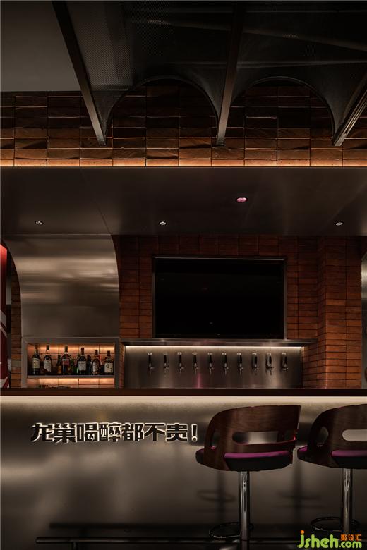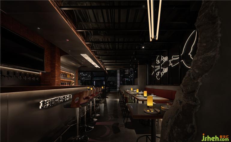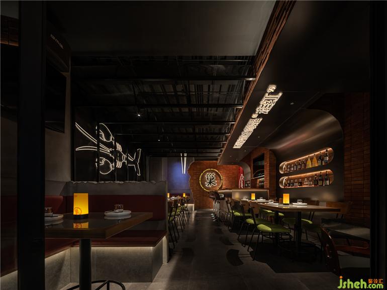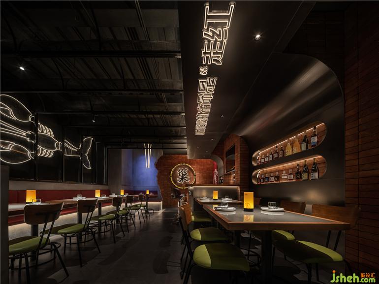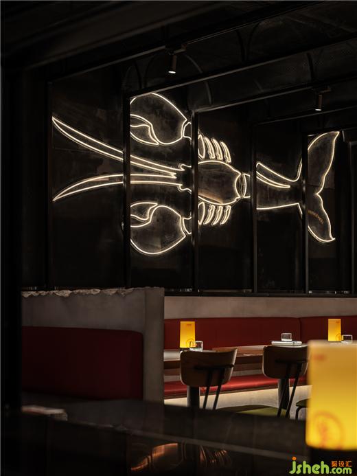 日升明亮,午間柔和,夜晚朦朧。光的介入,讓空間變得流動而長續(xù),作為流動的圖象,光在空間里得到了充分的釋放。龍巢餐酒館設(shè)計通過置于空間中的大型燈光裝置,映射出龍巢的烤魚龍蝦主題,美食與裝置藝術(shù)相映成趣。各色冷暖光從各處迷幻曖昧的探出頭來,呼應(yīng)營造神秘又舒適的飲酒氛圍。