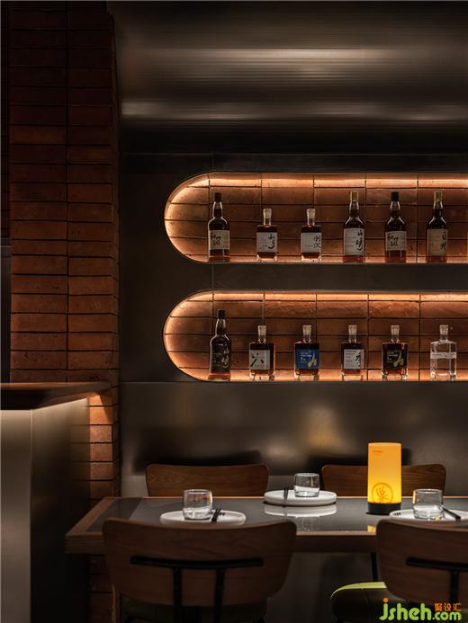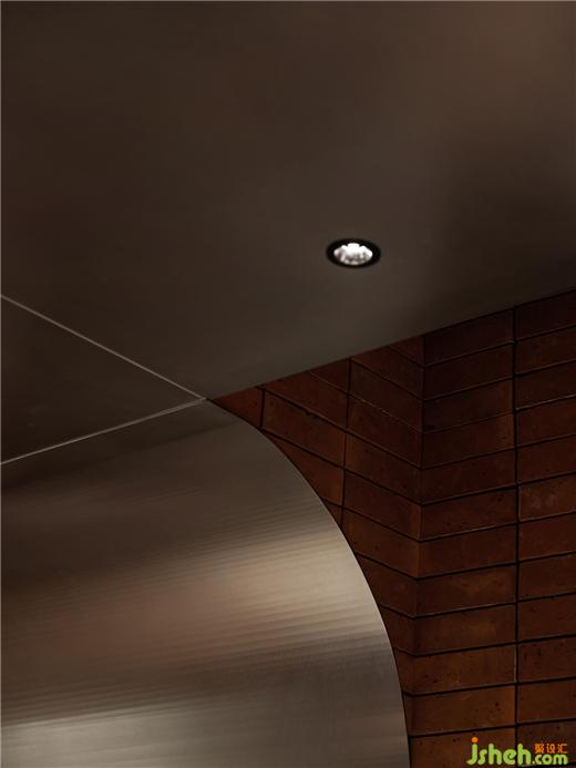 踱入其中,空間意象經(jīng)由材質(zhì)組合實現(xiàn)解構(gòu)與傳遞,光的金屬面與裸露在外的原始磚砌結(jié)構(gòu)形成了鮮明的對比,混凝土、不銹鋼、光在此融于一體,龍巢餐酒館設(shè)計打破空間固有格局,完成空間氛圍營造,向食客傳遞舒適而自如的場域信號。