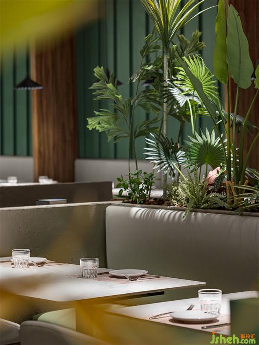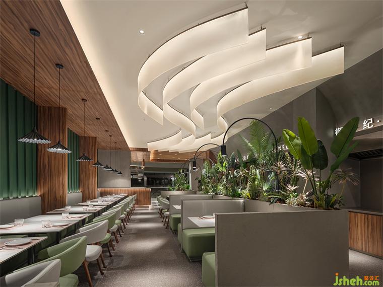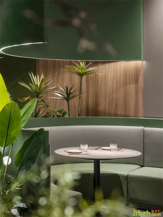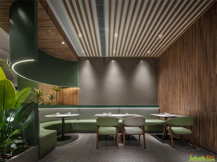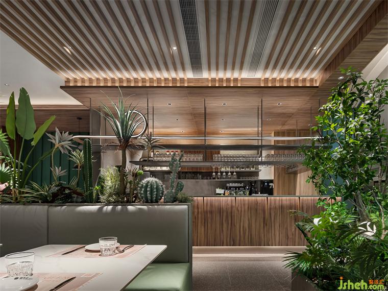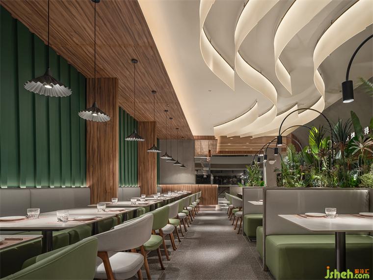 邂逅一片原始森林,迎接儀式感的開端。牛排餐廳設(shè)計簡單開闊的門頭構(gòu)造、木質(zhì)紋理與綠景的完美視覺集合率先定下森系而詩意的主要基調(diào)。墨綠色曲面中空觀景小露臺、清新綠植帶呼應(yīng)空間主題,醞釀輕松自在的氛圍。