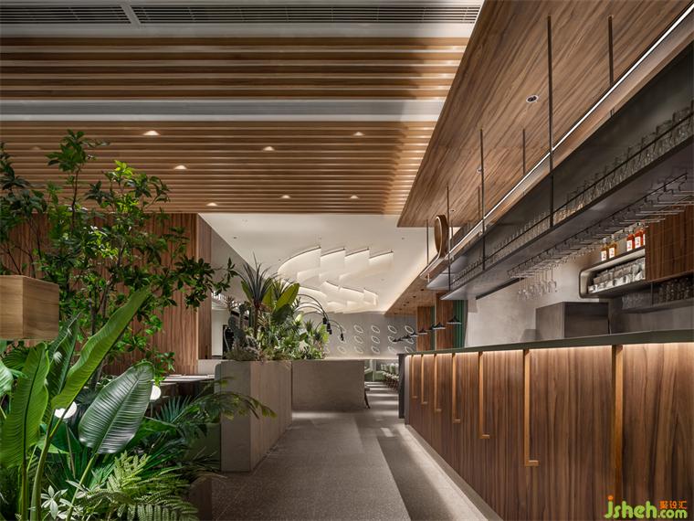 踱步進入森林,探尋自然的奧秘。對外是櫥窗般絕佳展示位的觀景臺,向內(nèi)則圍合成半圓的小型卡座,一景兩用,精致且淡雅。簡練的天花鋪裝線條從就餐區(qū)向水吧延展,產(chǎn)生明確的交匯與秩序。