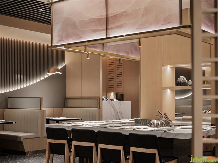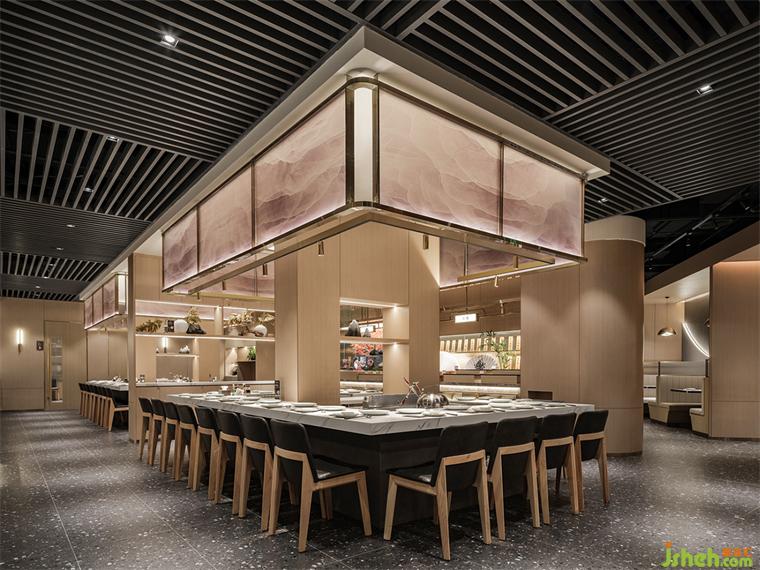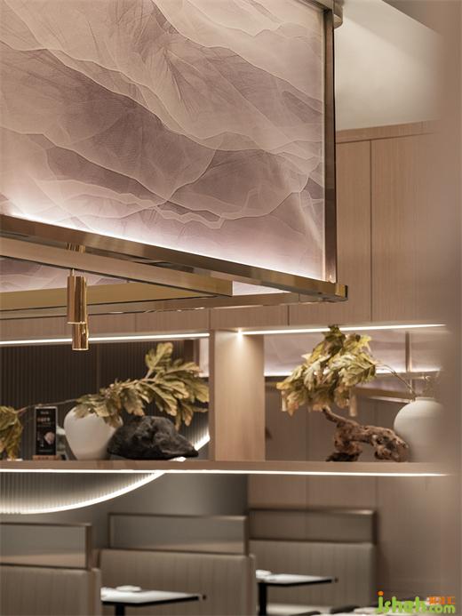 原木色沉穩(wěn)的質(zhì)感配以香檳金,傳達(dá)著大漁摩登輕奢的調(diào)性。吊楣紋理如縹緲云霧涌動(dòng),亦似海水泛起的洶涌波濤,蘊(yùn)藏自然界隨性無規(guī)則的靈動(dòng)美感。鐵板燒設(shè)計(jì)瑰色映襯出大海平靜的一面,在暖色燈光烘托下更顯柔和。翻涌的濤紋、優(yōu)雅的瑰色一動(dòng)一靜,展現(xiàn)大海瞬變的樣貌。
