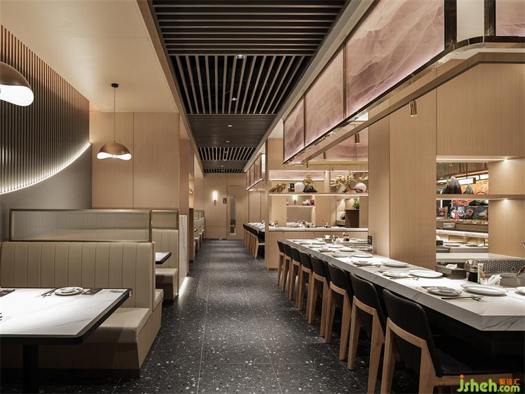 風(fēng)云起,海潮升。漁船啟,嘹歌響。本案大漁鐵板燒以“潮起大漁”為主題,將海浪、航船、漁網(wǎng)等主要意向以抽象具象結(jié)合的形式,和空間功能完成藝術(shù)化的融合,書寫下海與漁的故事。