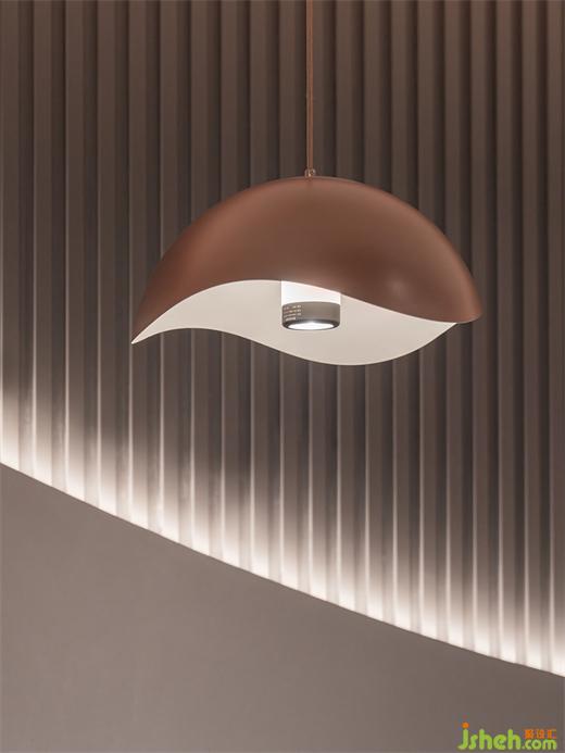 圓弧形向下勾勒的曲線,是漁船與海水連接的交界。從浪花線條中提取形態(tài)的燈具,點(diǎn)亮夜色下的航船。深水載舟,水波與行船搖搖晃晃,靜謐和諧。