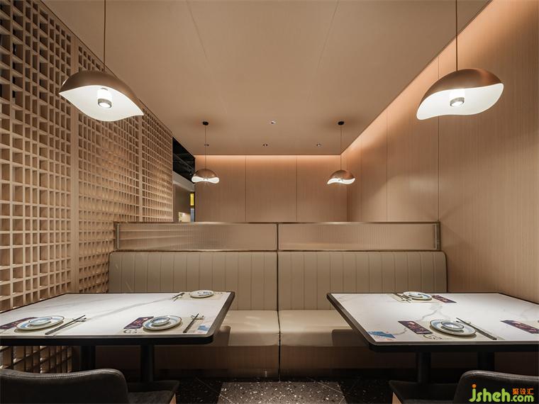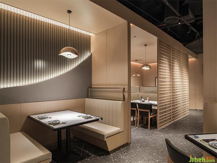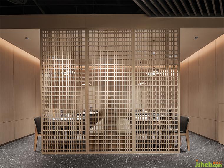 鐵板燒設(shè)計(jì)縱橫交錯(cuò)的原木色鏤空隔板將內(nèi)外就餐區(qū)一分為二,劃分出獨(dú)立且較為私密的小隔間,十字網(wǎng)格的設(shè)計(jì)保留了空間視覺的通透性與呼吸感。