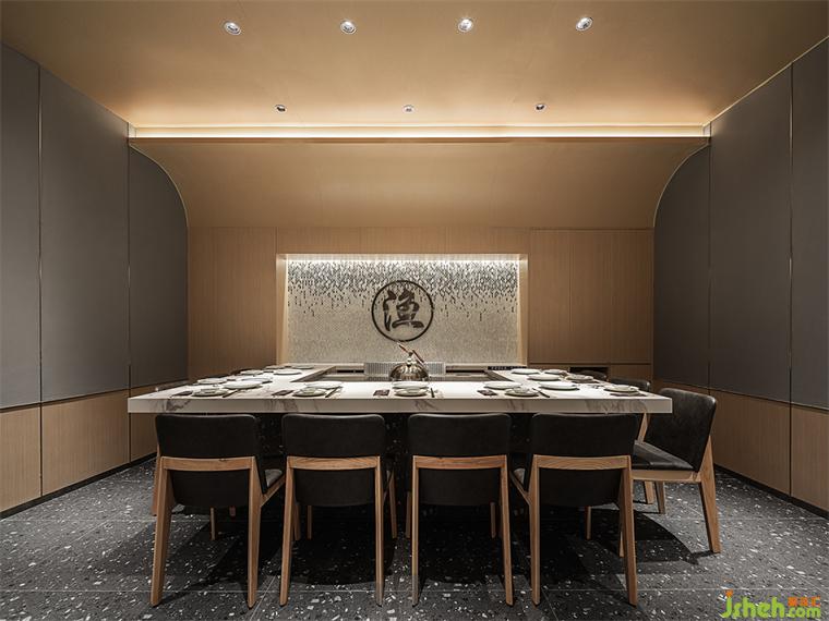 進(jìn)入包間內(nèi),收獲船艙里觀海的獨(dú)特視角。鐵板燒設(shè)計(jì)天花與墻面連接處呈現(xiàn)翻滾的海浪型,契合航行捕魚的主題,使得與海相關(guān)的風(fēng)物變得更可視化。推拉門的設(shè)計(jì)讓2個(gè)空間的分隔與貫通自由靈活。