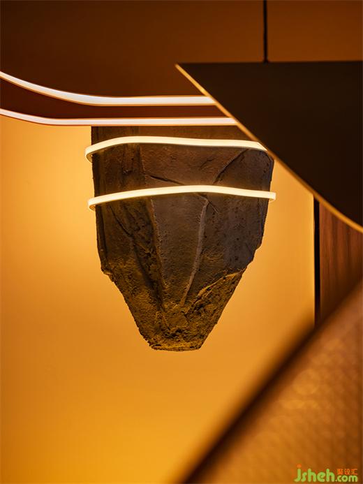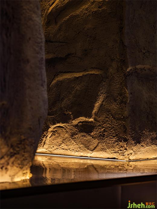 凹凸不平的塑石假山墻面象征崎嶇的火星地表,天然的形態(tài)巖色在時尚現(xiàn)代的裝潢中增添一絲完全不加修飾的原始樸素美感。