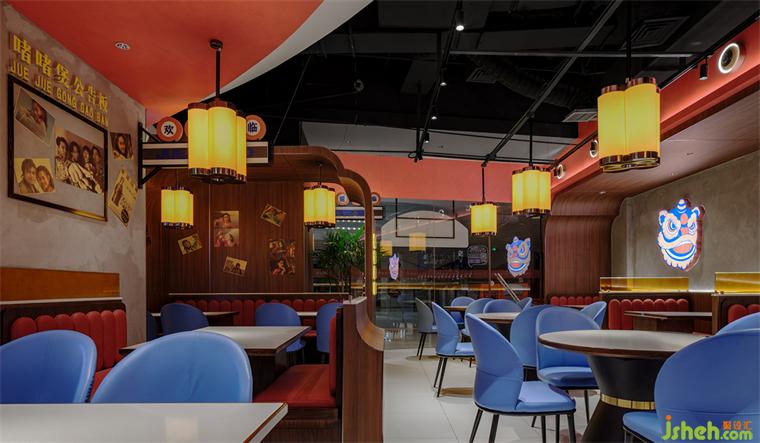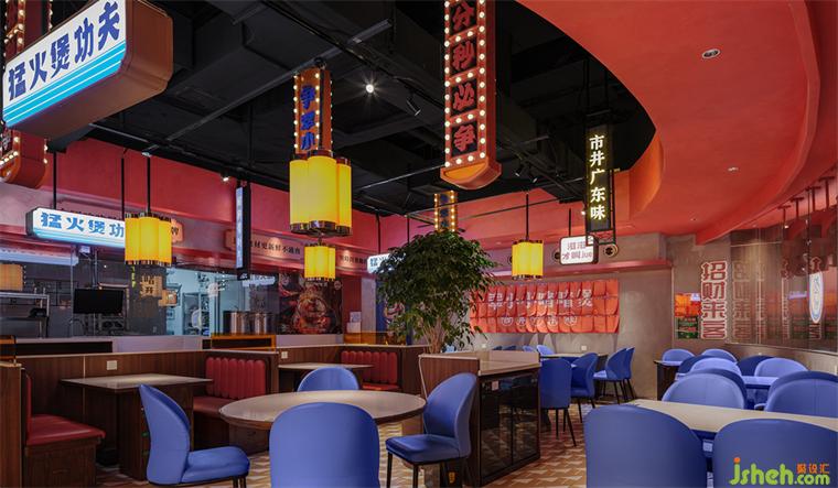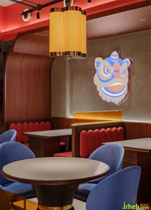 紅色,蘊(yùn)含現(xiàn)代廣東人喜愛(ài)的大吉利是、興旺發(fā)財(cái)?shù)暮貌暑^。藍(lán)色,嶺南建筑鐘情的淺淡基調(diào)。二者相互映襯,餐廳設(shè)計(jì)以冷暖對(duì)比強(qiáng)烈卻不違和的茄紅色和翠藍(lán)色成為空間主色調(diào)。