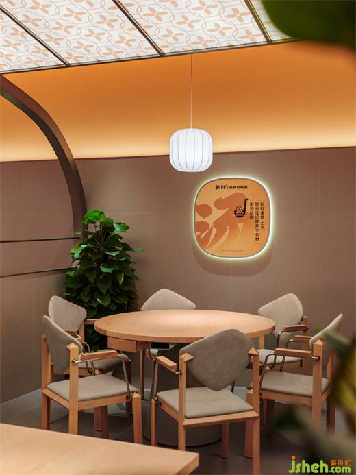 進(jìn)門處左手邊,向外傾斜延伸的屋檐之下,依次陣列5張6人圓桌。漸變色的“水米湯火鮮”噴繪布燈箱串聯(lián)起獨(dú)特的如軒秘訣文化墻,搭配暖色調(diào)的就餐燈光,使家庭里團(tuán)圓相聚的煙火氣息在此處具象化。人與場(chǎng)景共同成畫,借助簡(jiǎn)單平凡的生活畫面為空間增添溫情的氛圍。