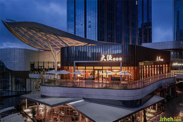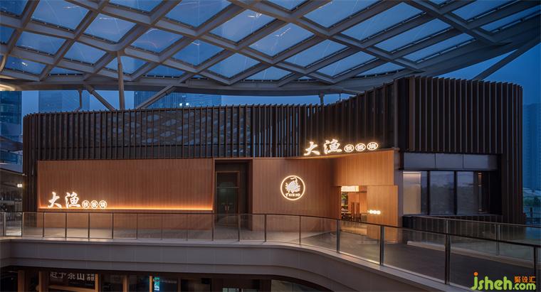 選址在惠州市中海環(huán)宇天地2層的新店擁有顯著的建筑景觀展示面,藝鼎設(shè)計(jì)師結(jié)合大漁品牌的屬性、舒展的“魚鰭”挑檐和曲線型圍合的外墻攔河結(jié)構(gòu),將建筑立面打造成形似魚身的半通透造型。借助鏡面材質(zhì)倒映出的城市天空和高樓也成為了外立面風(fēng)景的一部分,突顯商業(yè)與城市的完美融合。