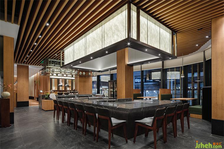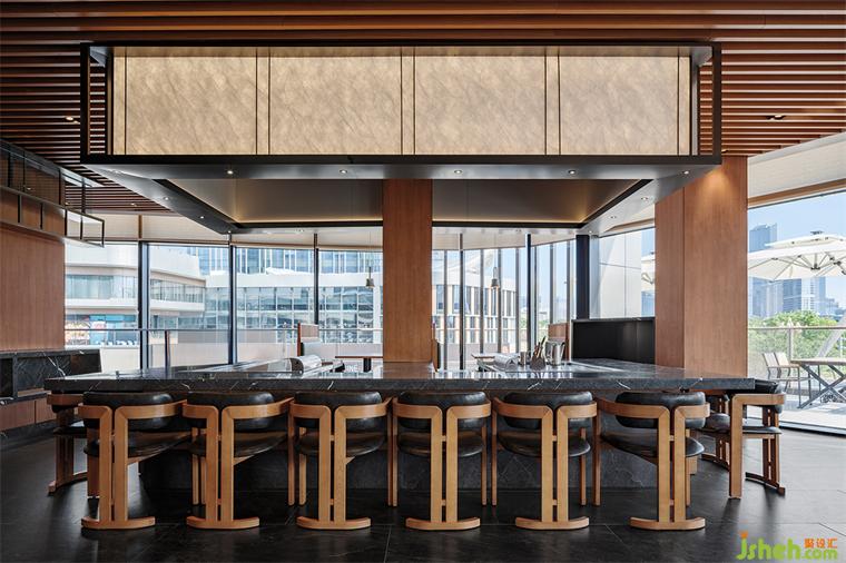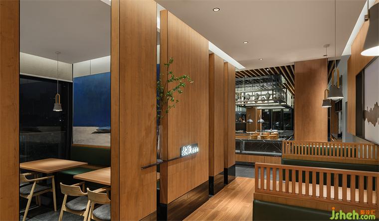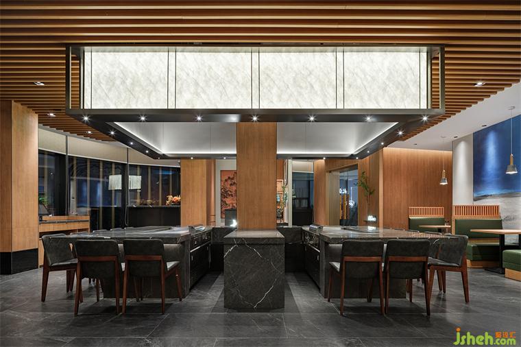 鐵板燒設(shè)計(jì)灰色巖板臺(tái)面、深色仿古磚地面、大理石和石材等有質(zhì)感的材料運(yùn)用,確保了空間的沉穩(wěn)平和。大面積木紋與深綠色沙發(fā)的介入,在低調(diào)深沉的風(fēng)格中增添簡單的輕盈和舒適感。玻璃落地窗記錄著白天與黑夜變換交織的景象,隨之流動(dòng)的除了吊楣的光線,還有食客身處不同時(shí)間的微妙情緒。