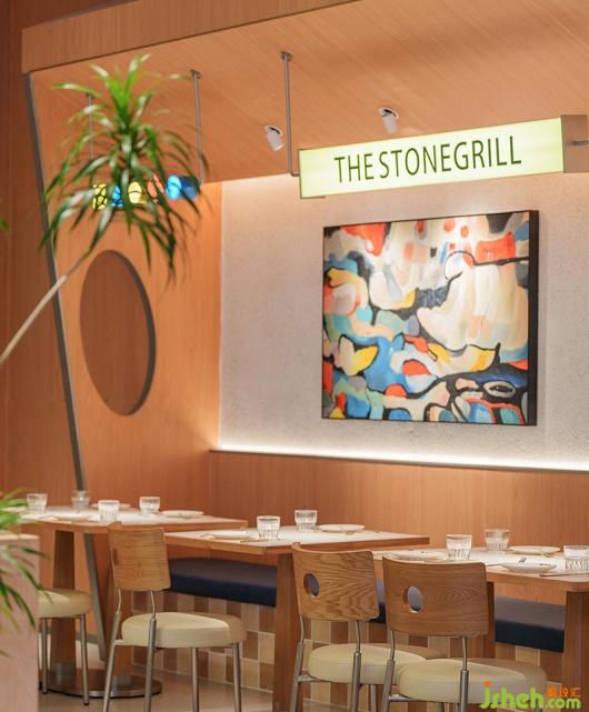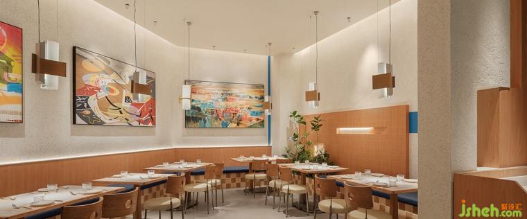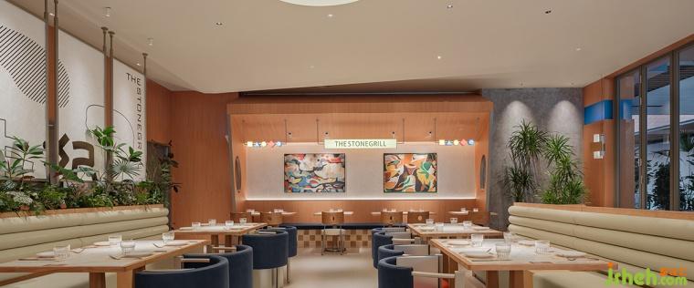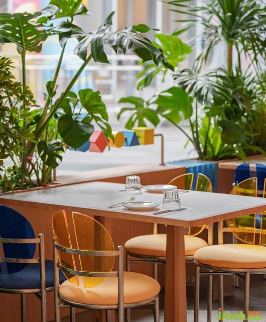 分區(qū)運用凹凸構(gòu)成、錯落疊級的手法,清晰突顯功能,過渡連接三大就餐區(qū),呈現(xiàn)多元的空間效果。體塊與幾何的結(jié)構(gòu)、色彩與材質(zhì)的穿插,就像蒙德里安格子畫的抽象形式,在規(guī)整的秩序中展現(xiàn)自由隨性的跳躍感。
