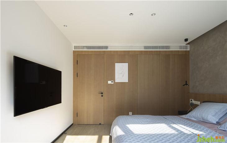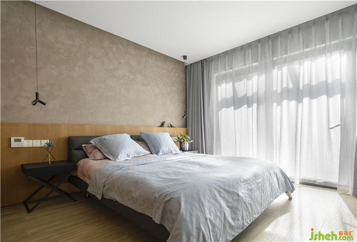 臥室結(jié)構(gòu)盡量簡化,依據(jù)功能設(shè)置進行色塊構(gòu)成,水泥漆的加入對比出木作的暖。