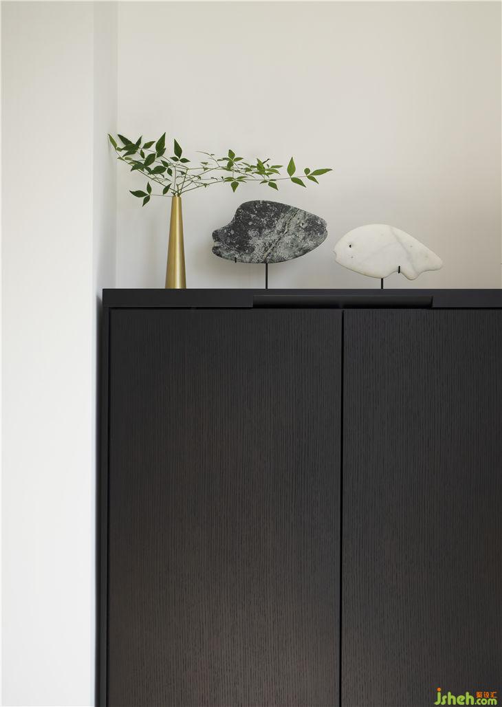 餐廳左側(cè)是從地下車庫進來的入戶門,為了維持整個空間的簡潔,入戶門做成了隱形門。餐邊柜上的插花植物就是院子里折來的,經(jīng)濟、方便四時常有,卻非常的惹人注目,筆者大愛。