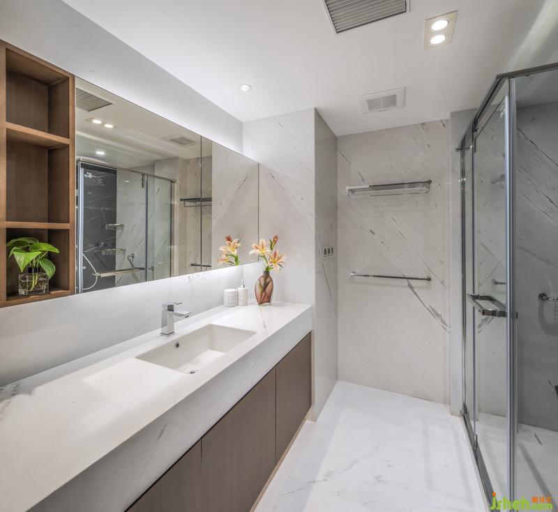 衛(wèi)生間功能性設(shè)置為主,馬桶區(qū)淋浴區(qū)與臺(tái)盆區(qū)并列設(shè)置,長(zhǎng)長(zhǎng)的鏡柜一半封閉一半敞開,兼顧儲(chǔ)物與日常生活。