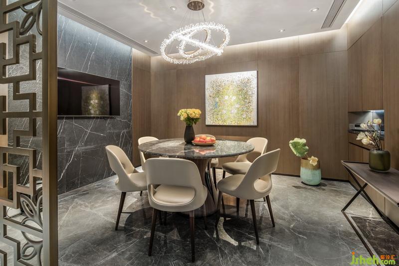 由于是度假住宅,餐廳區(qū)并不大,由于建筑缺乏戶外窗戶,因此四周光帶和頂部冷暖交替的燈光設(shè)計(jì)成為空間重點(diǎn),讓就餐空間溫馨中略顯氣質(zhì)。