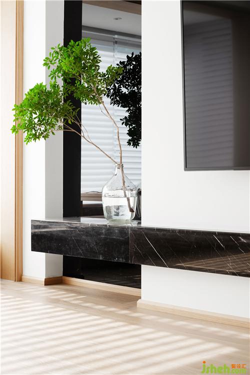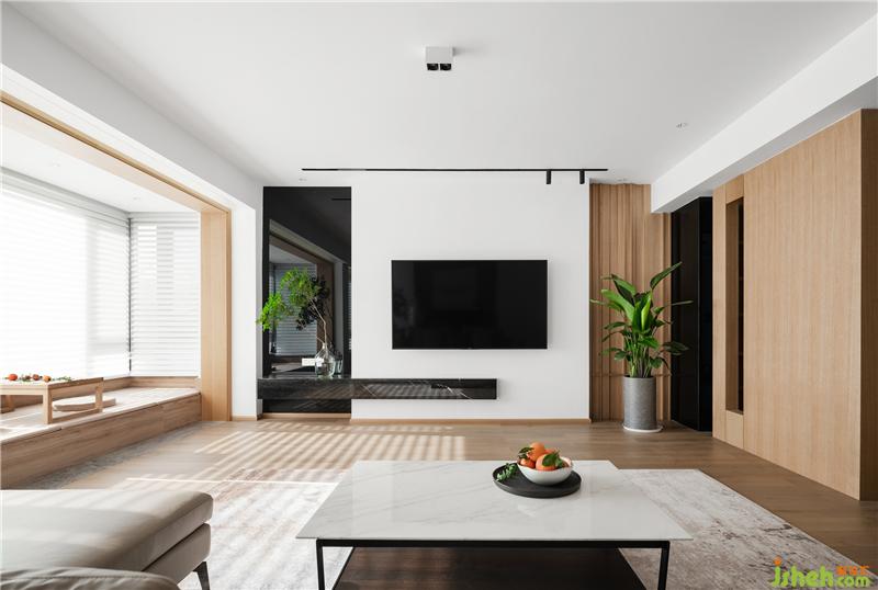 電視墻沒有采用高檔的材料,選擇乳膠漆、黑鏡、木作營(yíng)造出與戶外陽光一致的舒適感。