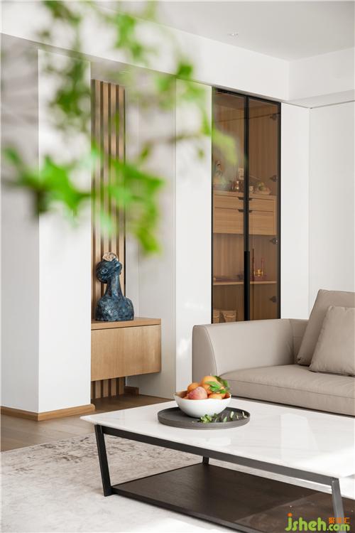 業(yè)主信佛,所以設(shè)置了玻璃柜門的佛龕,沙發(fā)背后是鋼琴區(qū),所有的公共活動(dòng)均在客廳得到合理錯(cuò)落的安排。