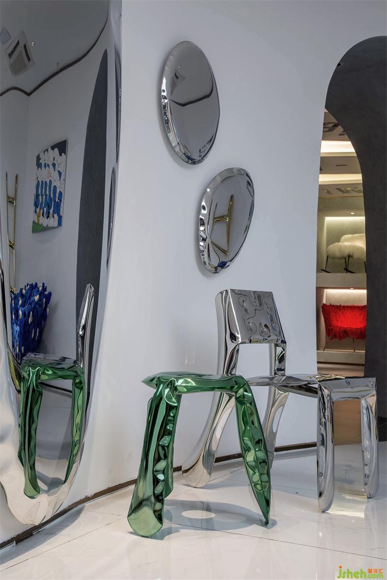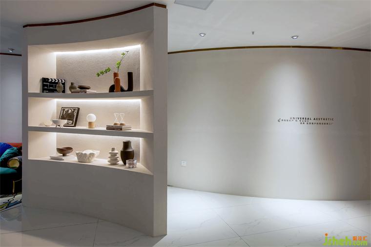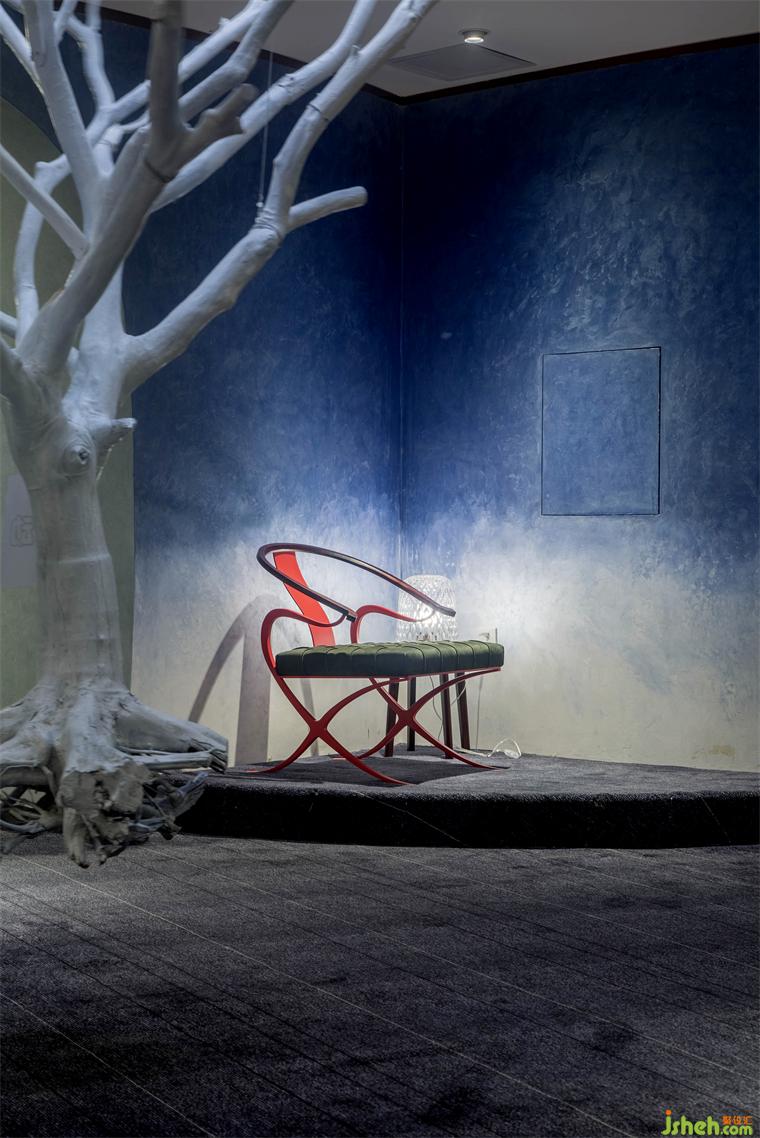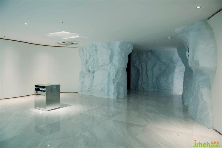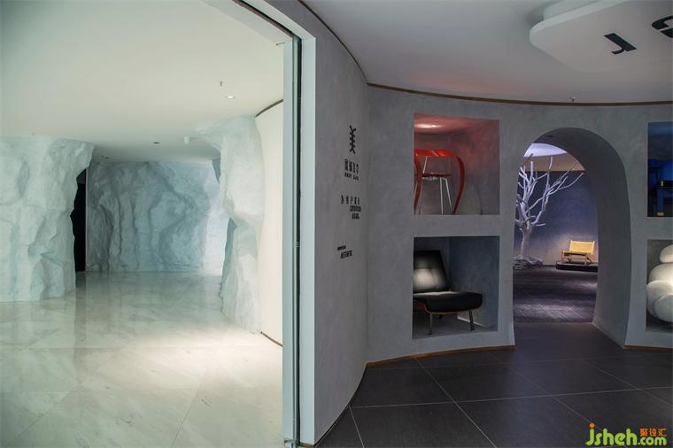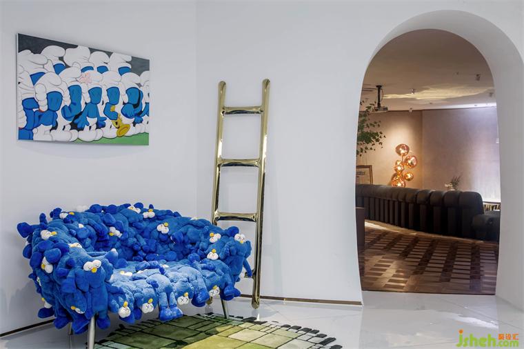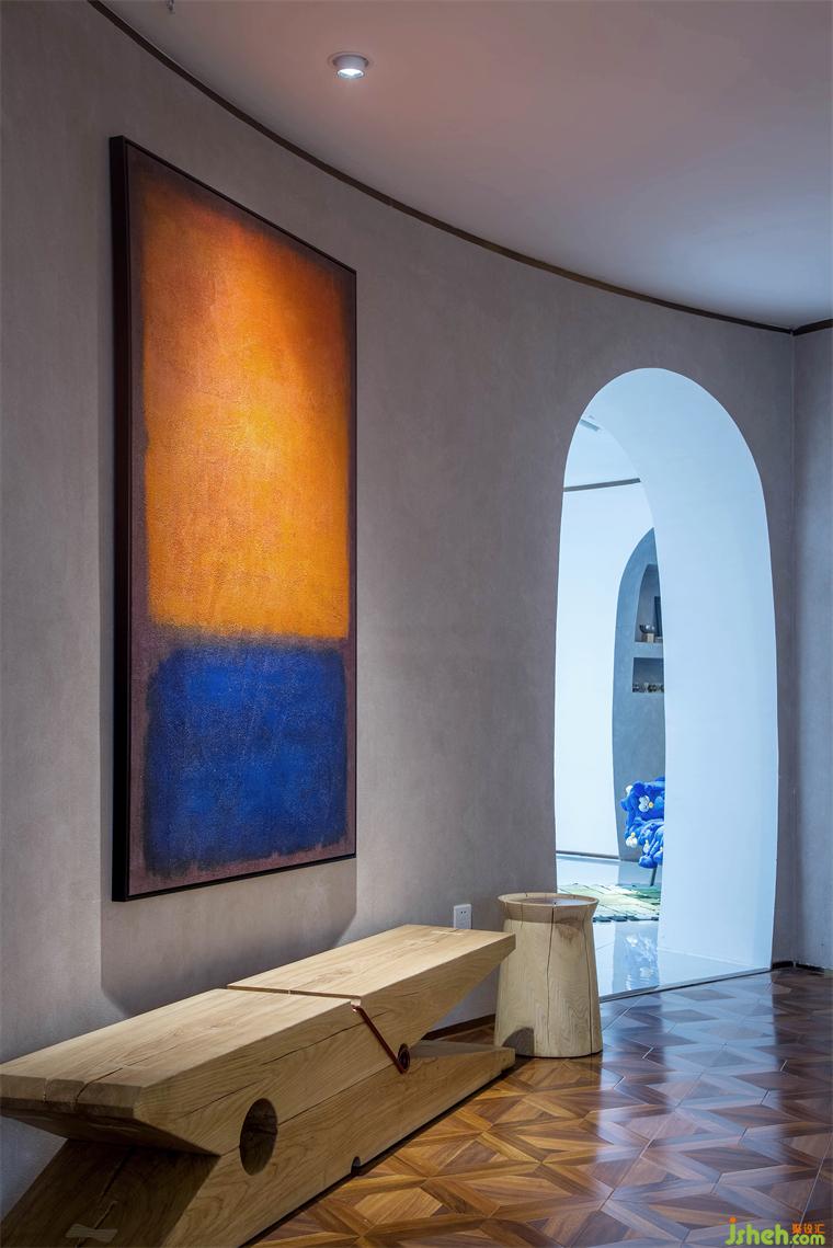 節(jié)奏和韻律可以調(diào)動起人們對美的感知力,設(shè)計師別出巧思,運用了多種手法來豐富空間的變化和延伸,在表現(xiàn)技法上,通過各個空間不同的調(diào)性設(shè)定,使得空間有了節(jié)奏和生命力。人從拱形的入口進入,穿過如洞穴般昏暗的前廳回廊,被明亮的出口召喚著,來到致敬藝術(shù)的殿堂,回神又跌入藍色的遐想空間……弧線圍合的空間既各自獨立又互有聯(lián)系,它們串聯(lián)起一種觀賞節(jié)奏,使人跟隨塊面轉(zhuǎn)折不自覺扭轉(zhuǎn)對場域的認知,如同踏入走馬燈的奇趣視界,即便走進尾聲,也意猶未盡。