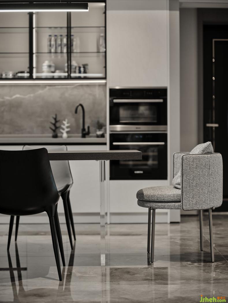 深棕色立柜從地面抵到頂面,連接著客廳、餐廚兩大功能空間,在實現(xiàn)完美收納的同時也消解了白墻的寡淡。柜體上藝術(shù)裝置的細節(jié)點綴亮點滿滿,真正經(jīng)過思考的藝術(shù)品選擇、裝點技巧,都是于無聲處聽驚雷的狀態(tài)。