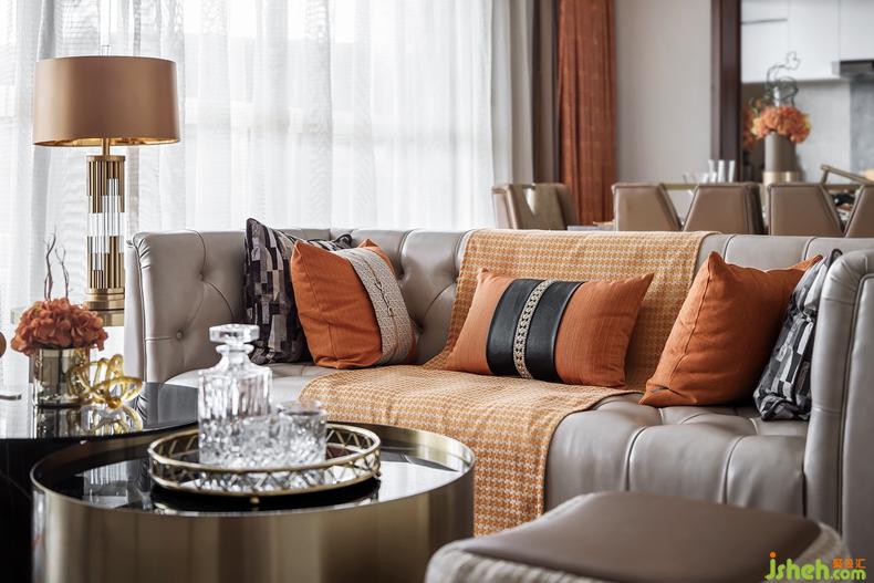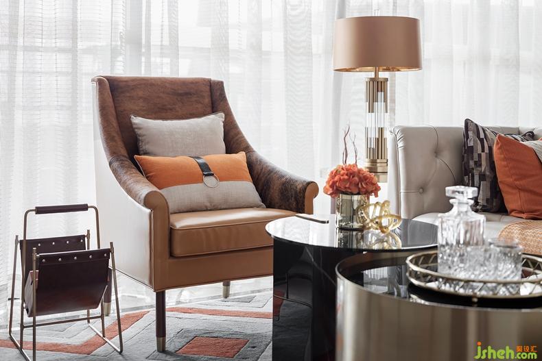 客廳重點(diǎn)突顯家具品質(zhì)在空間中的重要性,橙色的毛皮扶手椅是整個(gè)空間不安份的元素,造型舒展,仿佛向人發(fā)出邀請,落座瞬間,又有一種被溫暖環(huán)抱,擁有自己一片獨(dú)立私密的小天地的體驗(yàn)??臻g以橙色為主色調(diào)開啟了“摩登”藝術(shù)之旅,由HERMES絲巾裝裱而成藝術(shù)掛畫流暢大氣,一抹橙色激活墻面的生活氣息,別致的家具也處處透著主人的身份與生活品質(zhì)。