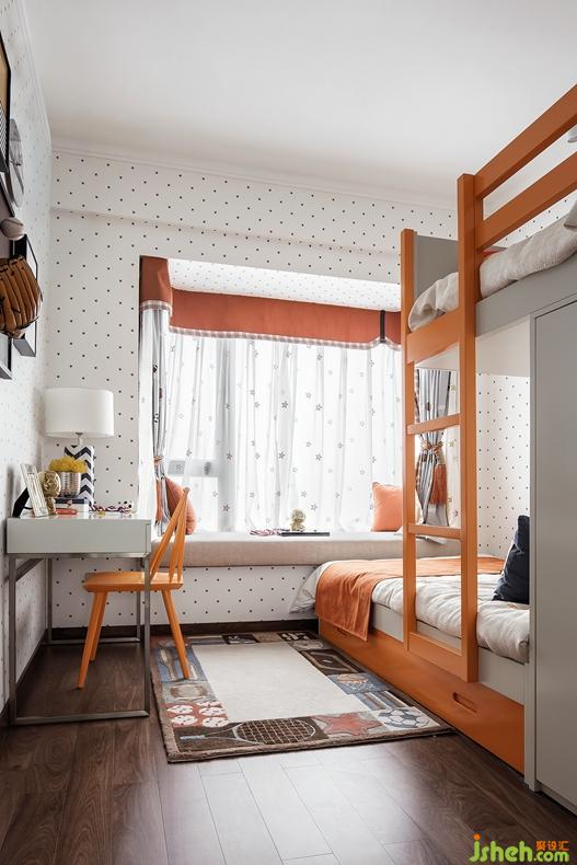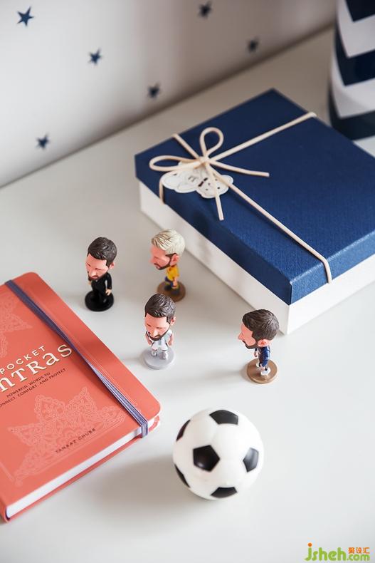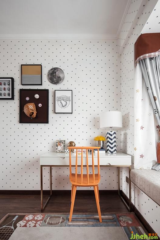 兒童空間自由充滿趣味,摒棄了常規(guī)的空間布置。橙色為主色調(diào)的家具、床品突顯了當代主義的整體基調(diào),書桌上踢球的球員、床邊的橄欖球套裝無不通往暢想的世界。藍白相間的陶瓷臺燈使空間材質(zhì)更加豐富,亮黃和橙色的大量運用,這是一個創(chuàng)意無限、童趣繽紛的空間。