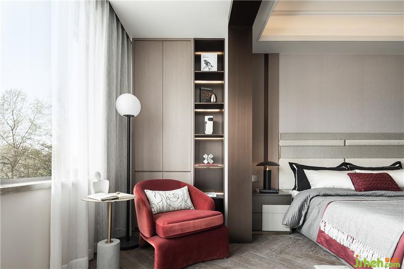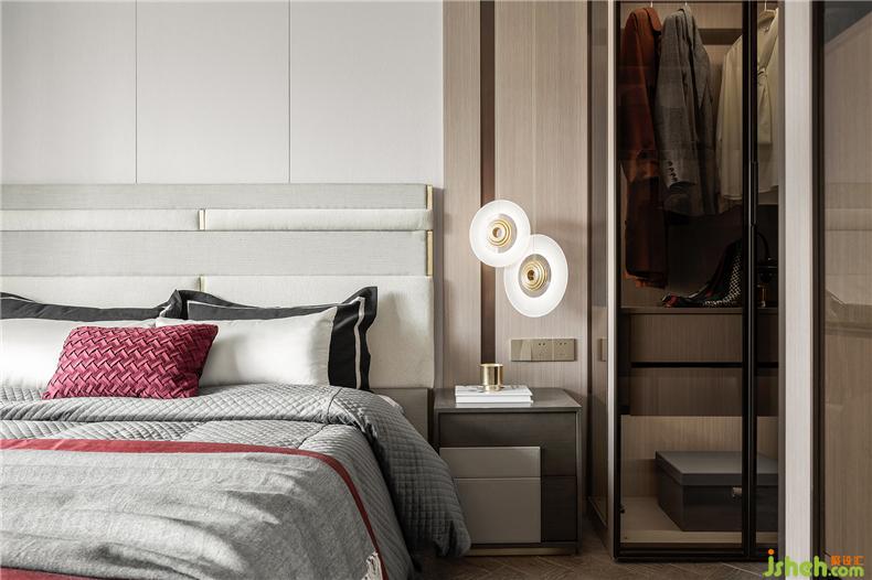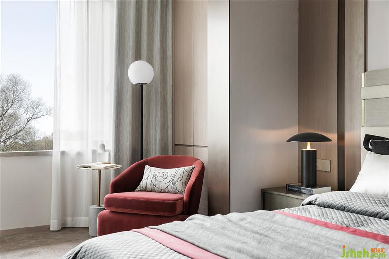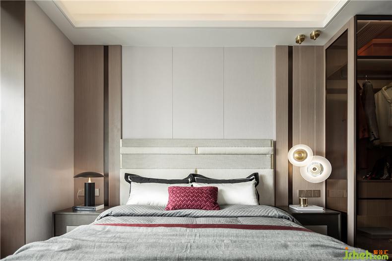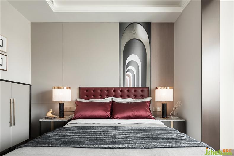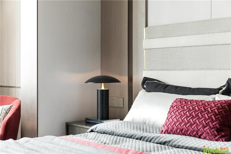 臥室的設(shè)計延續(xù)了客廳的用意,從墻體到軟裝,淡色調(diào)為主,樣板房設(shè)計不同灰度的色塊組合拼接,搭配酒紅色的布藝,格外醒目,精細車線工藝以及絲滑的材質(zhì)盡顯雍容大氣。
