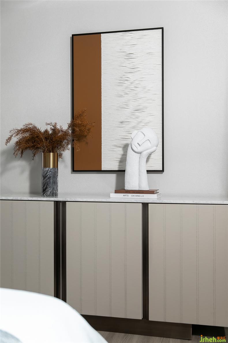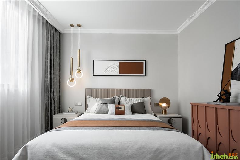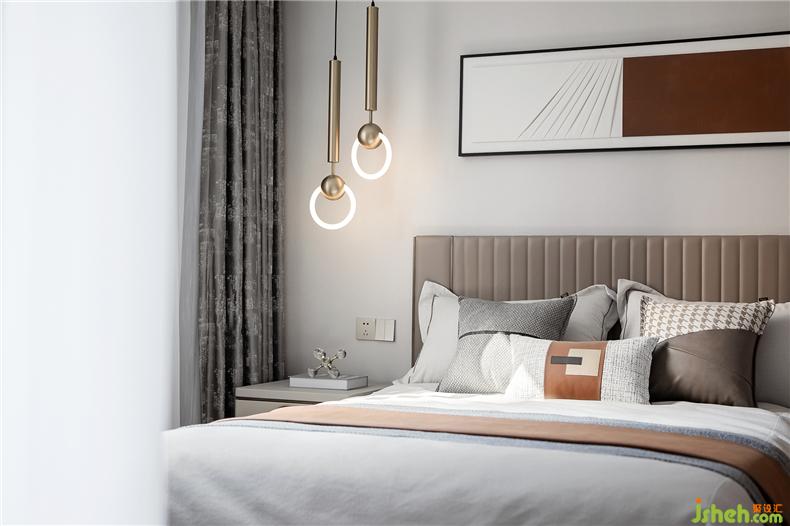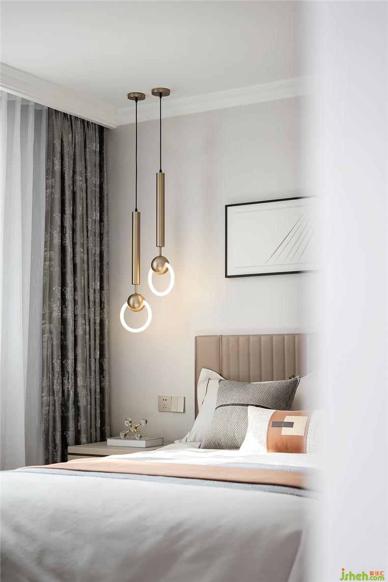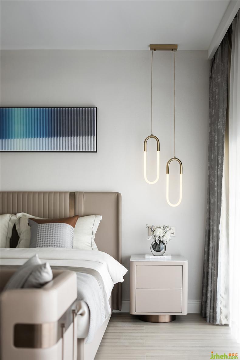 主臥靜謐有序,光影在彼此間形成隱隱的虛實(shí)關(guān)系,簡約家居和燈具型體,樣板房設(shè)計(jì)構(gòu)造出靜默安然的視覺感受,床尾不可或缺的獨(dú)立沙發(fā)和茶幾,提升居室的另一種休閑感。