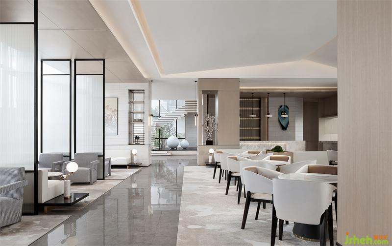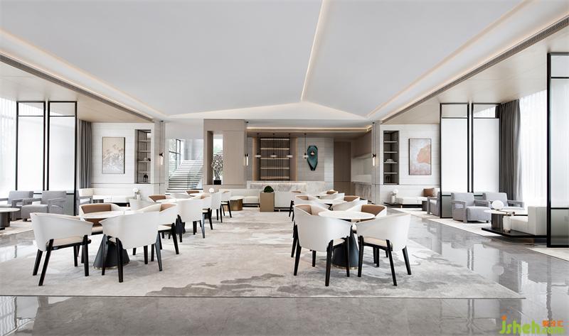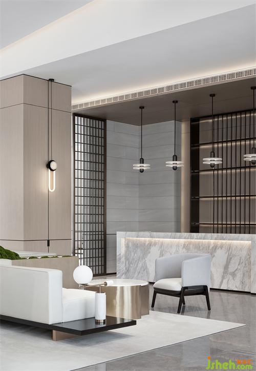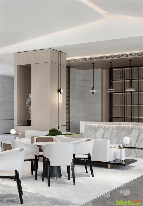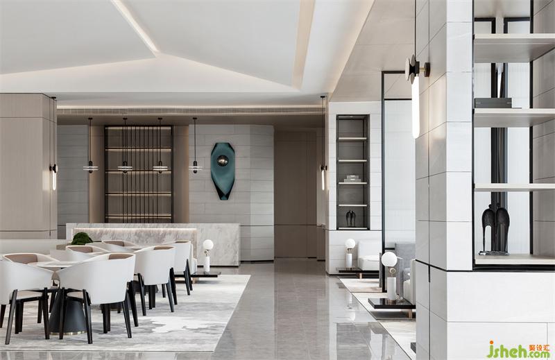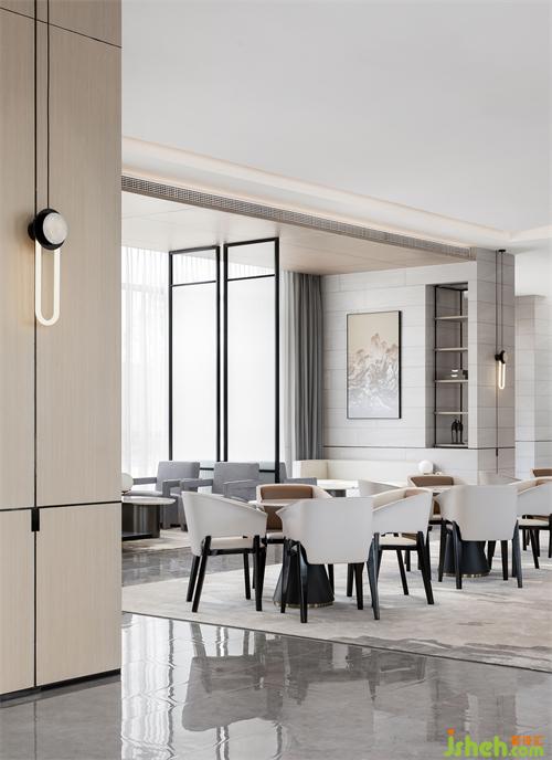 洽談區(qū)洗練的建筑語言,形成豁然開朗的空間序列。富有張力的天花、秩序有落的金屬玻璃屏風(fēng),為疏落的空間增添趣味性和節(jié)奏感。