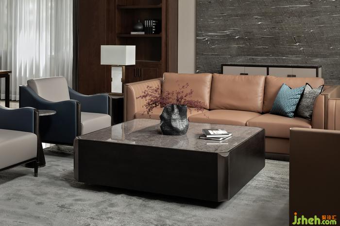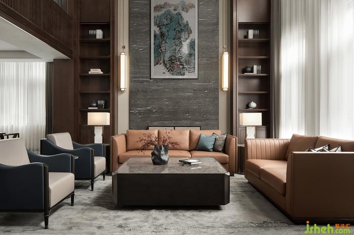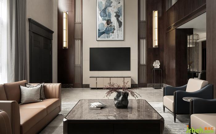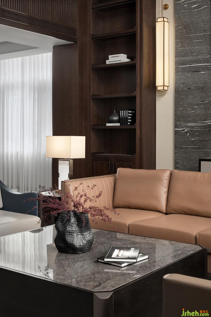 挑高的一層會客廳,大面積運用深色的木飾面,讓整個空間透著一股淡淡的木香。天然大理石和兩側(cè)裝飾柜相得益彰,裝飾壁燈點綴其中,營造出一派書香安靜的大宅氛圍。