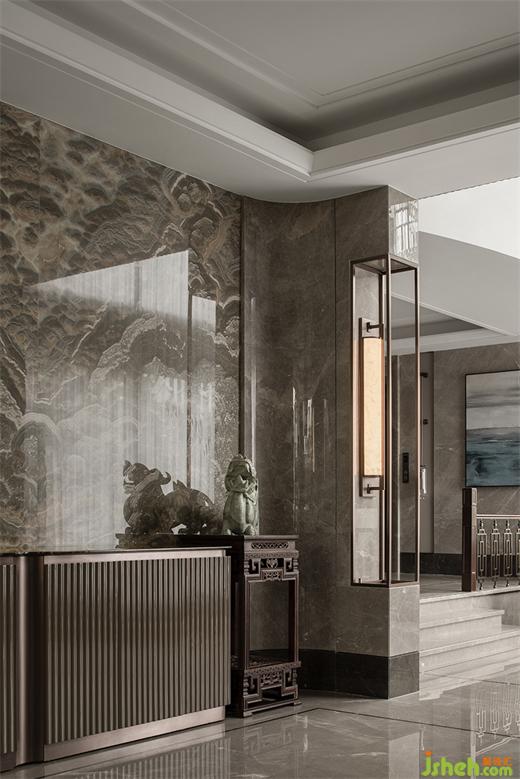 近似龍形的吊頂磚畫盤旋空中,古樸角幾上的瑞獸貔貅擺件,花園別墅裝修設(shè)計(jì)框定空間端莊大氣的主基調(diào),營(yíng)造出底蘊(yùn)深厚的東方文化獨(dú)有的韻致,再以雅致淺灰飾面作底,簡(jiǎn)練純粹的線條平衡了現(xiàn)代金屬的冷硬鋒利。